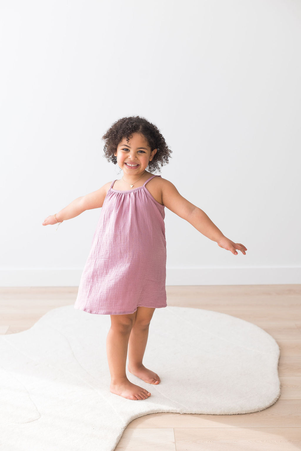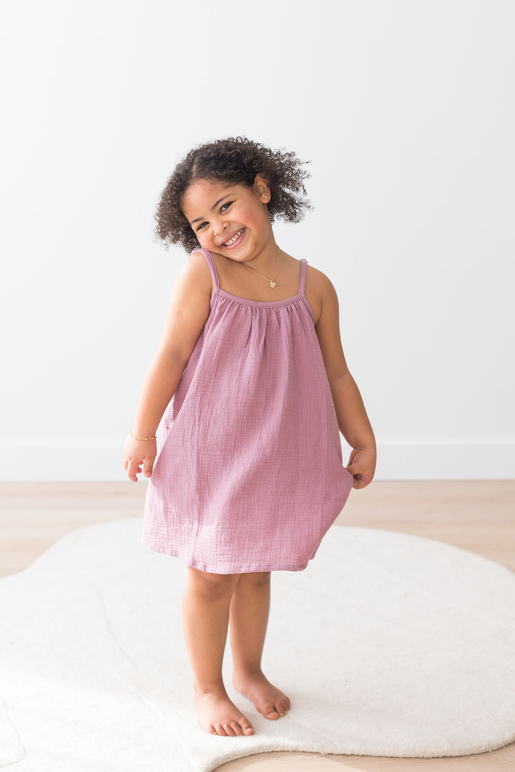 Our organic cotton muslin sundress offers your little one softness and breathability all day long. Crafted from gentle, hypoallergenic fabric, it's perfect for sensitive skin and helps keep her cool in warm weather. The adjustable straps provide a tailored fit as she grows, making this a dress she can wear for seasons to come. Whether she's playing in the sun or layered for cooler days, this versatile piece is a must-have in her wardrobe.