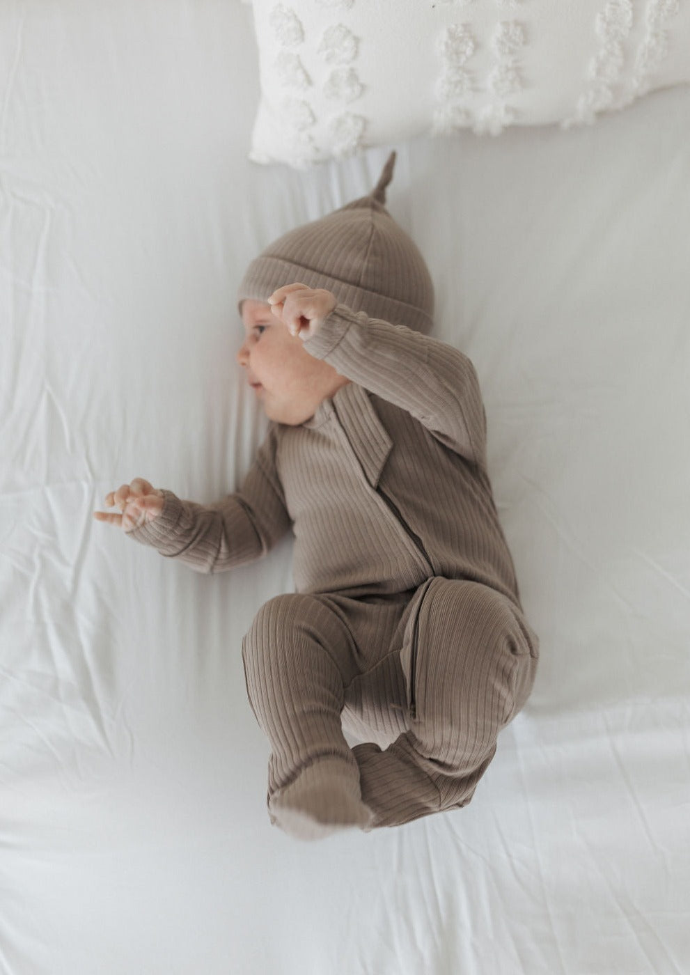 Your child will love snuggling up in our ribbed organic cotton sleepers! Our top-selling footies are incredibly soft and gentle on even the most delicate skin. Pair with one of our matching headbands or knot hats to complete the look.