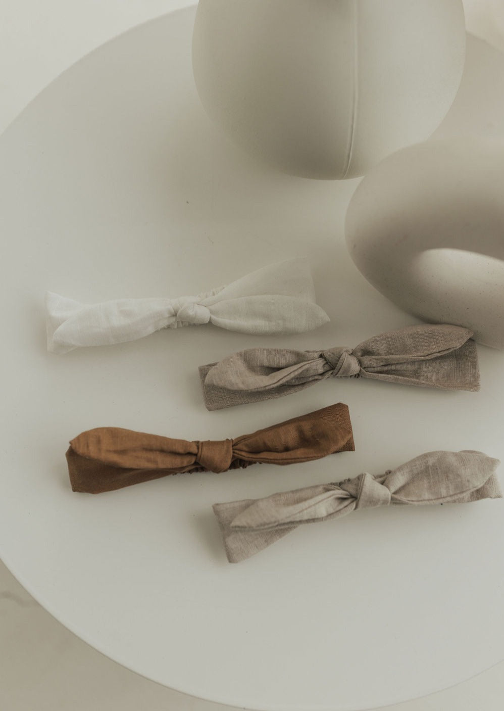 Nos bandeaux à nœuds en lin sont la pièce de base parfaite pour compléter n'importe quel look. Nous proposons une belle gamme de couleurs neutres qui peuvent facilement compléter vos tenues préférées. Ces nœuds sont conçus pour être doux, confortables et respectueux de la peau. Associez-le à notre robe à bretelles avec nœud ou à notre barboteuse à boutons en lin pour compléter le look.